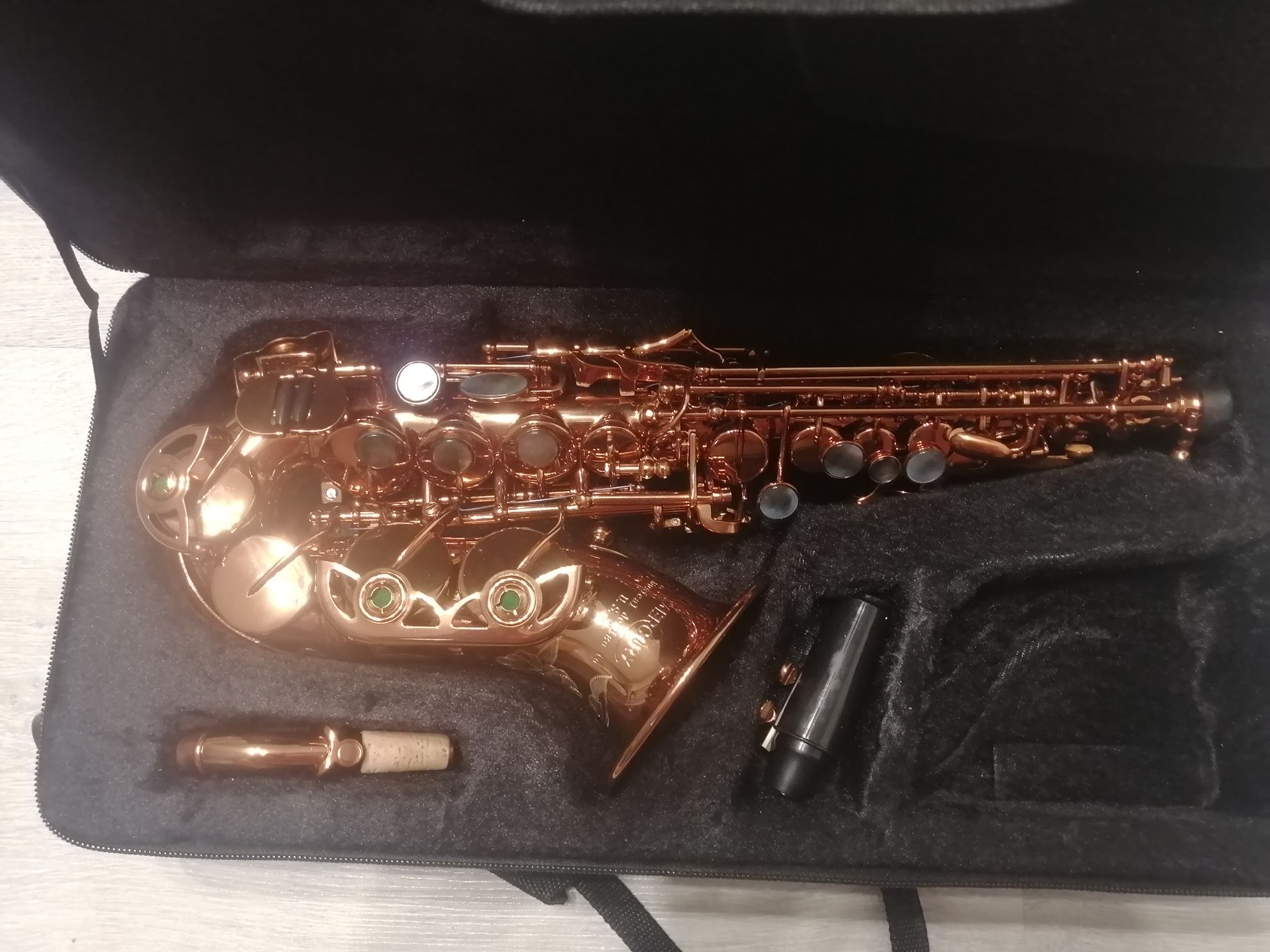Комплектация полная: саксофон, эска, мундштук с лигатурой и колпачком, наклейки на мундштук, родной фирменный чехол ,трости, гайтан.