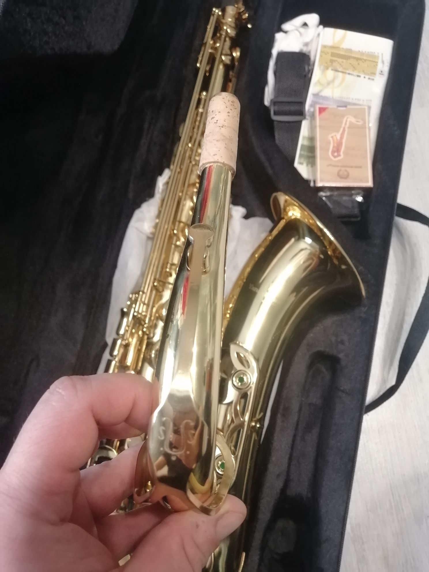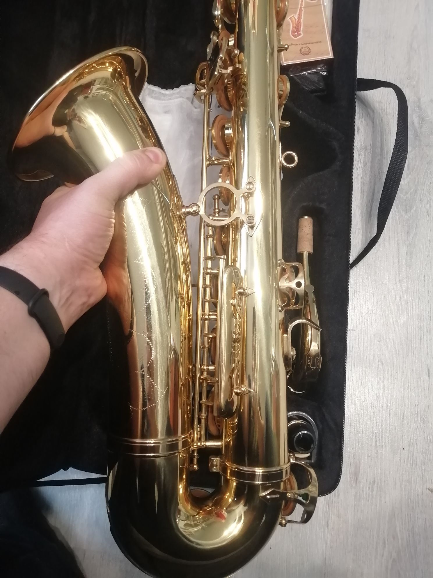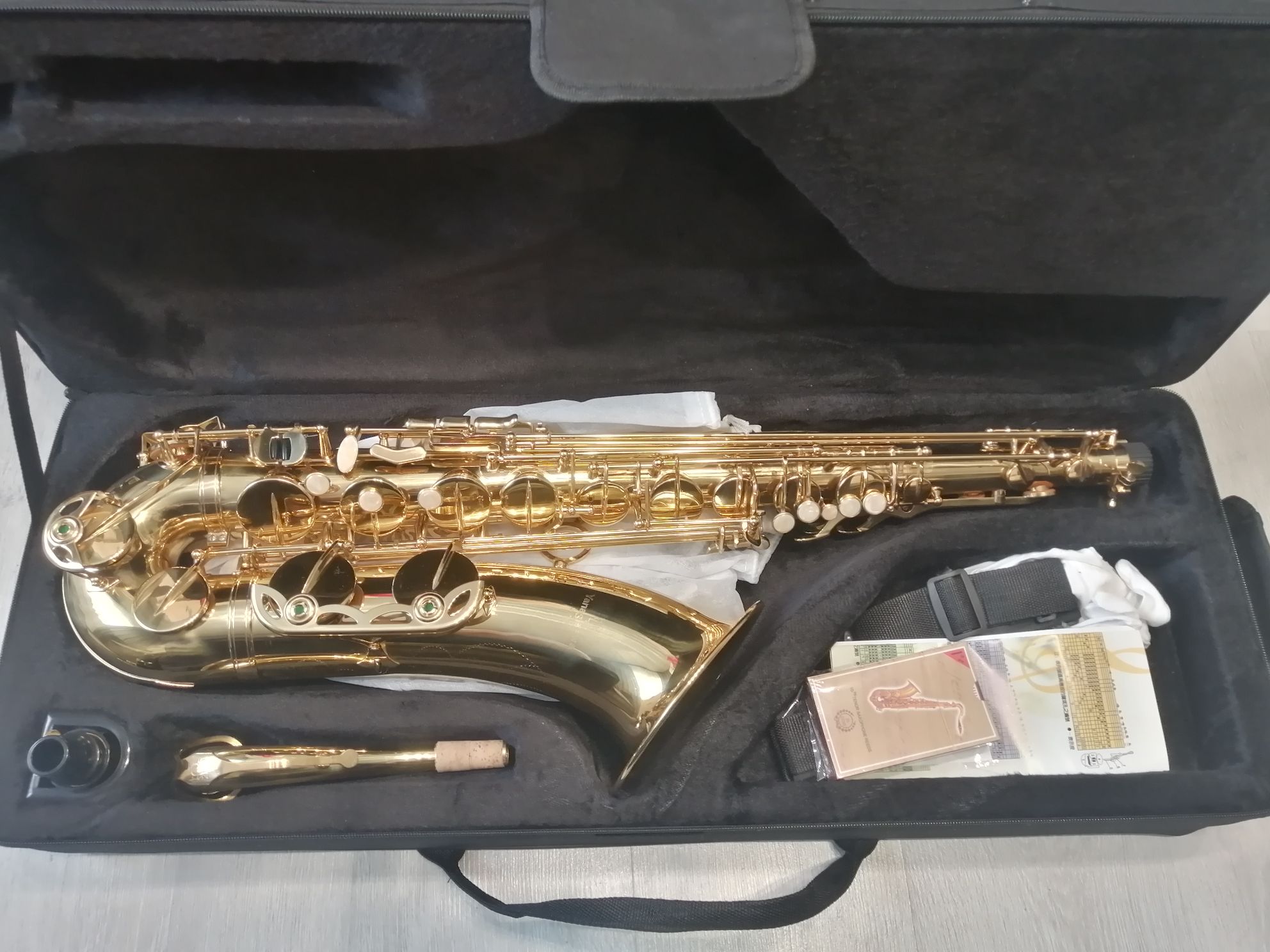 Комплектация полная: саксофон, эска, мундштук с лигатурой и колпачком, чехол, гайтан (нашейный подвеc), смазка для пробки эски, наклейка на мундштук, трость.