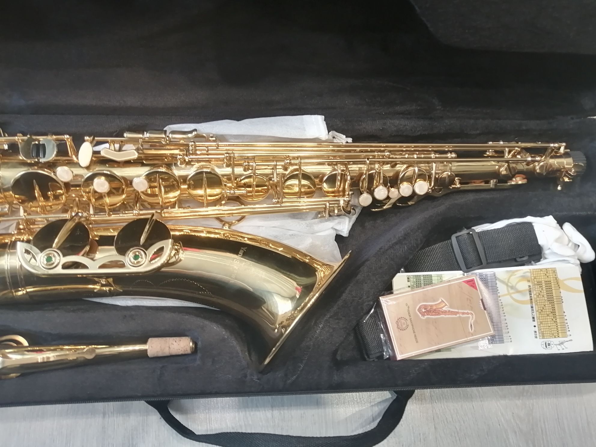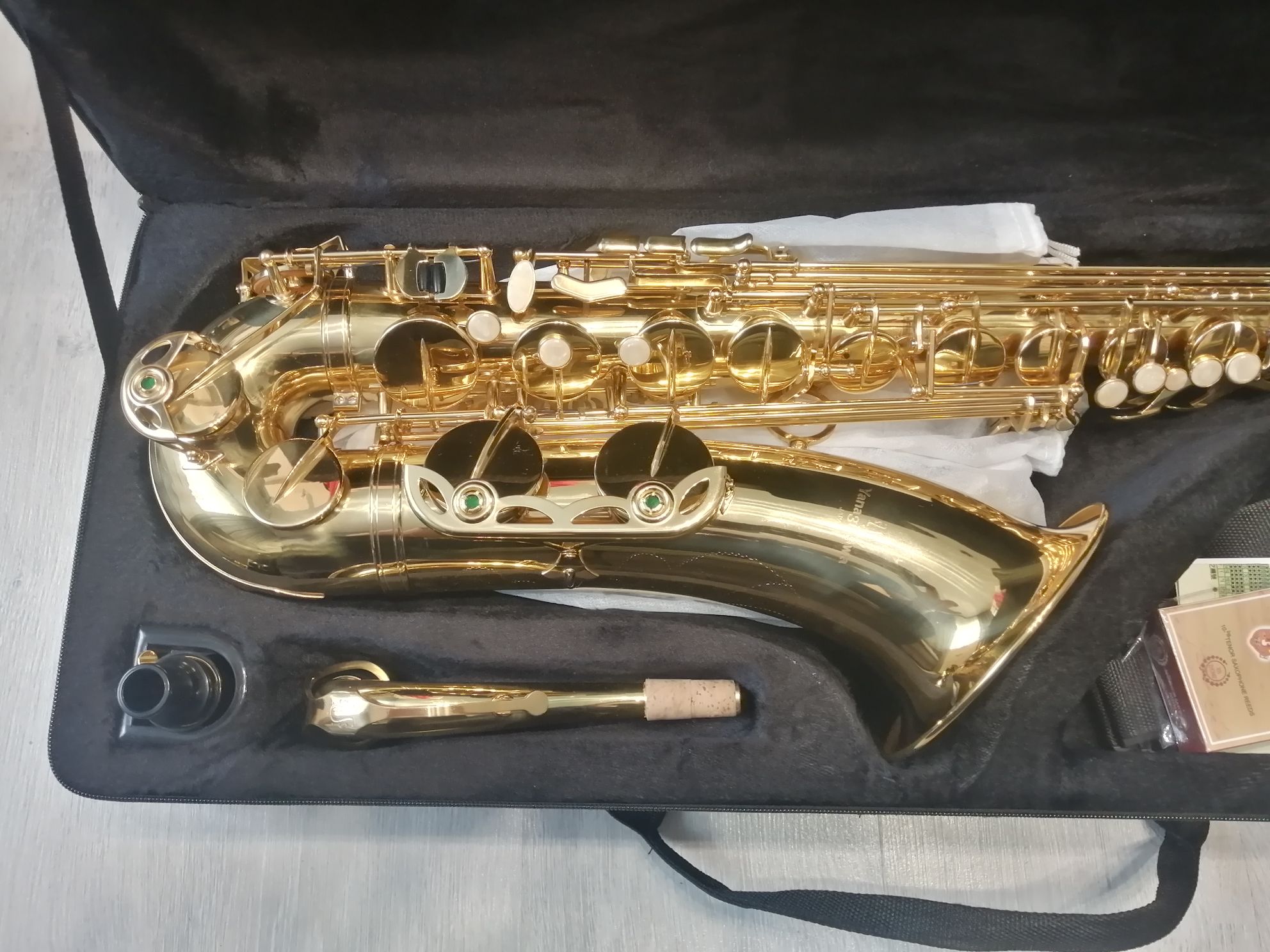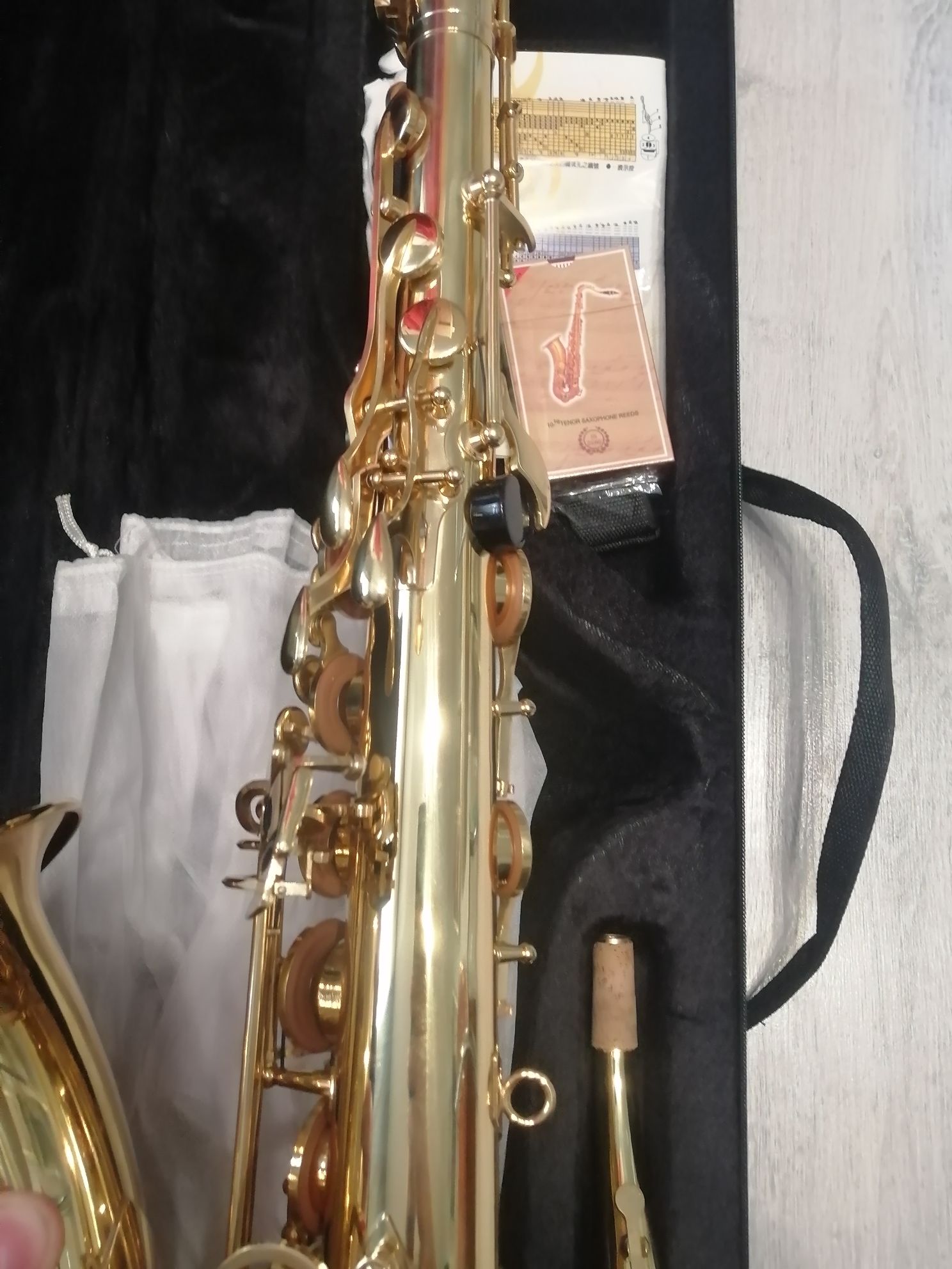 Комплектация полная: саксофон, эска, мундштук с лигатурой и колпачком, чехол, гайтан (нашейный подвеc), смазка для пробки эски, наклейка на мундштук, трость.