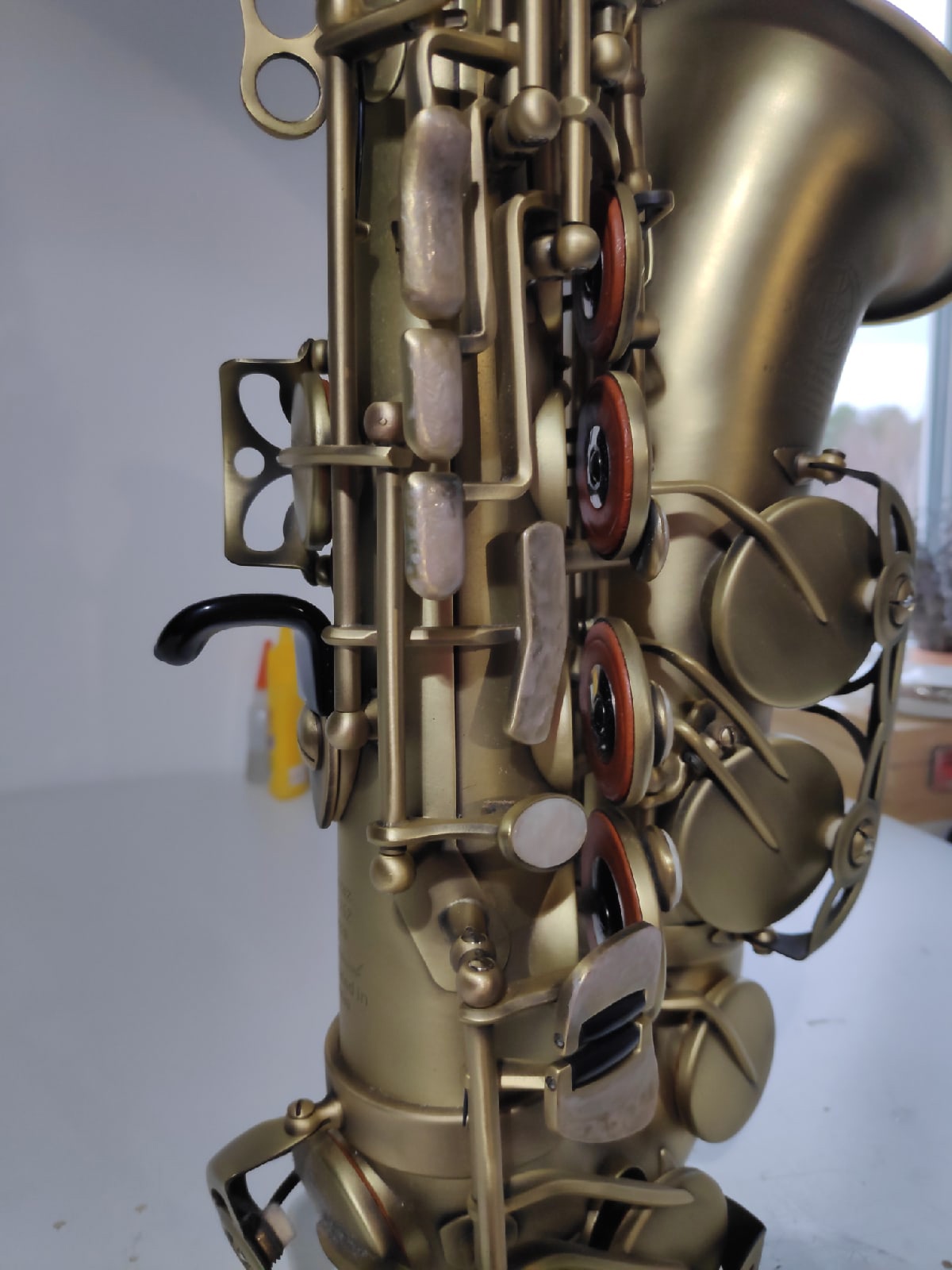 Товарищ попросил помочь с продажей. Инструмент практически в состоянии нового. На крючке под палец резина, чтоб было по мягче, на части клапанов лак для ногтей, чтоб не похабить родное покрытие. Дудка не билась, по самым мелким вопросам обращение к мастеру, никакого колхоза, все подушки родные. Не требует никаких вложений.