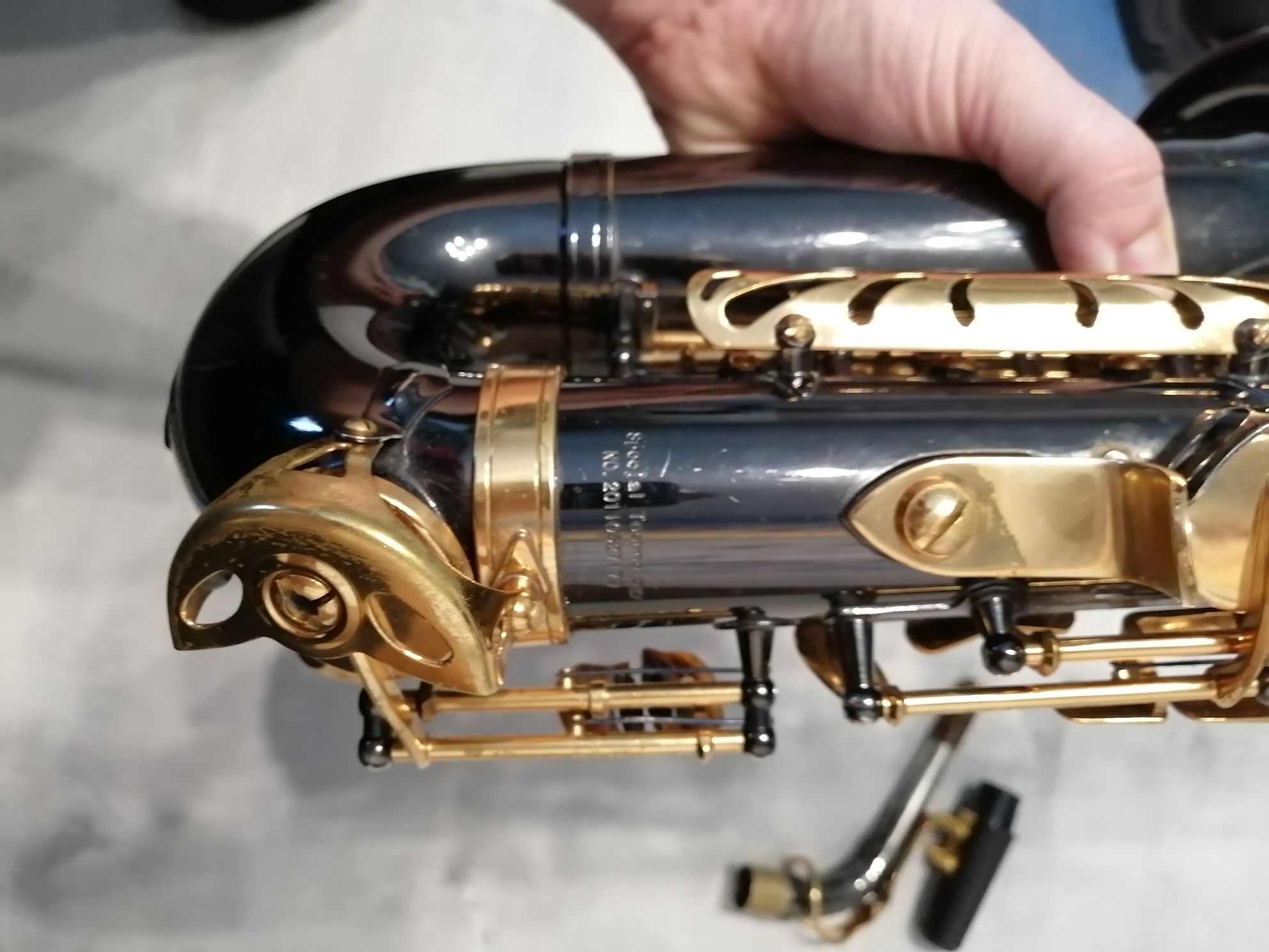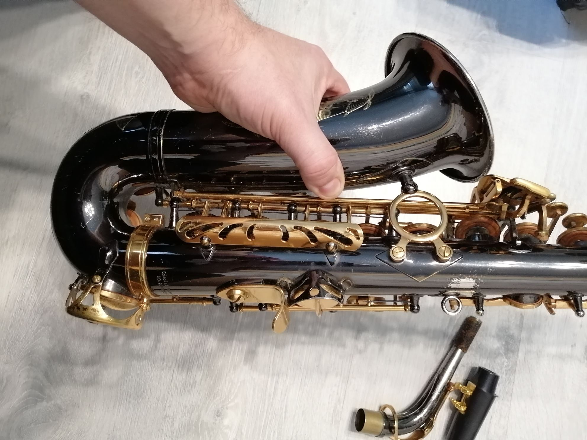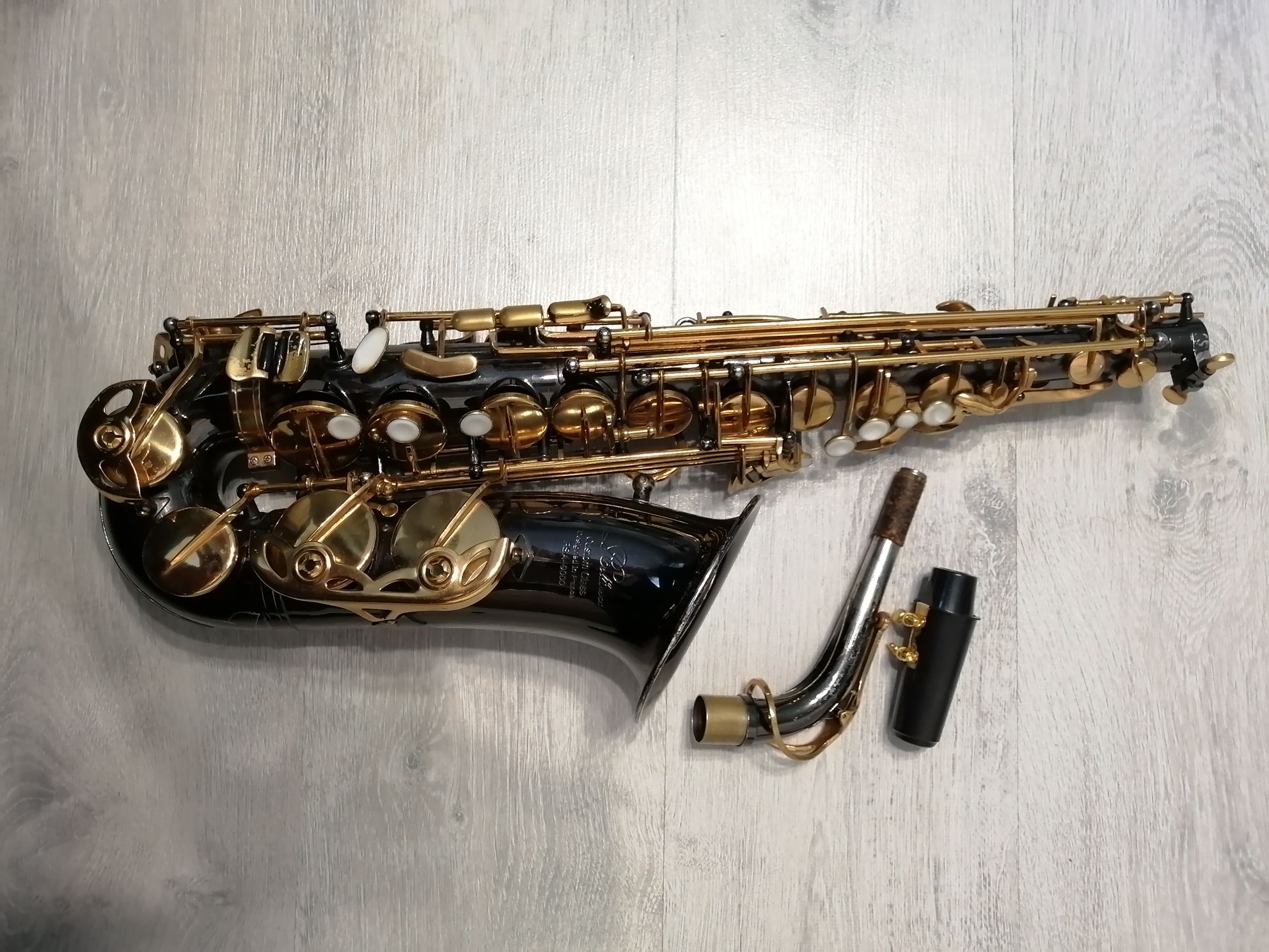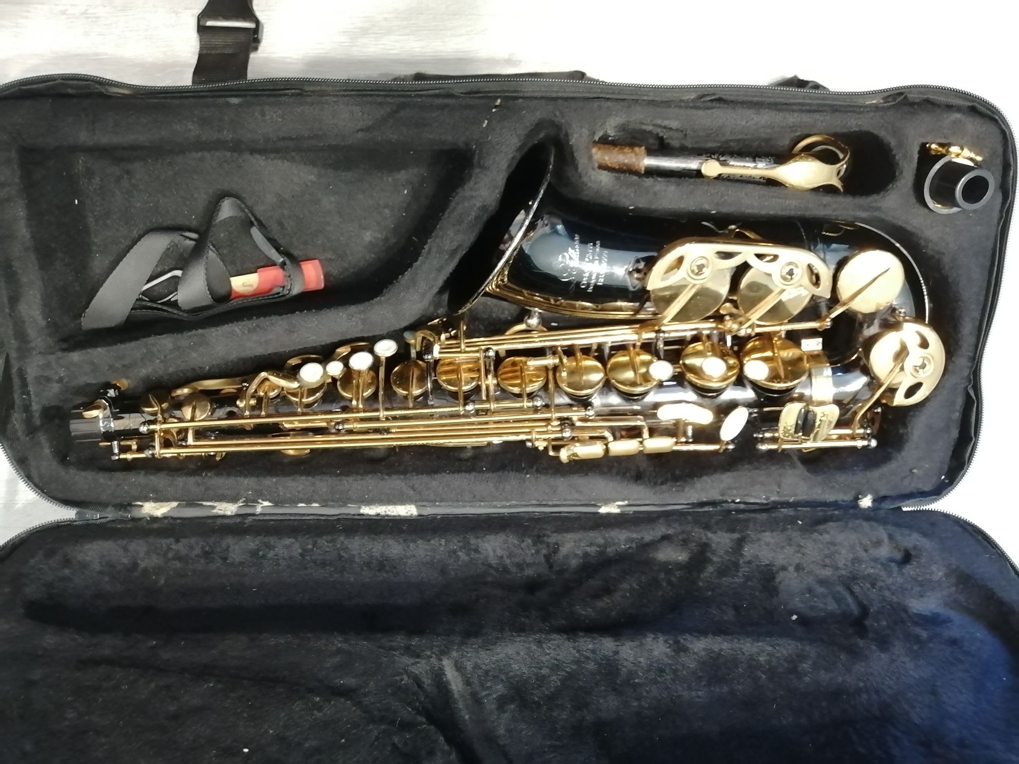 Комплектация полная: саксофон, эска, мундштук с лигатурой и колпачком , гайтан, трости, наклейки на мундштук, полужесткий кофр.