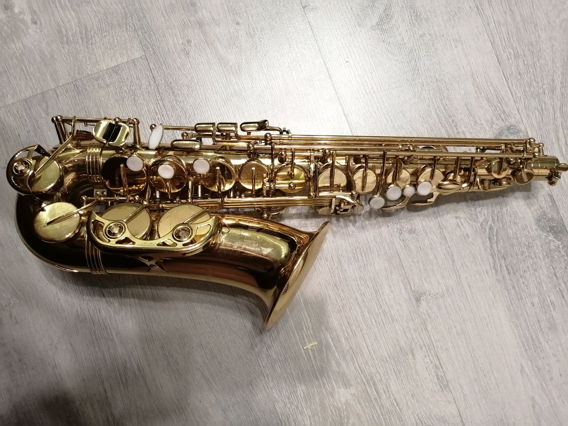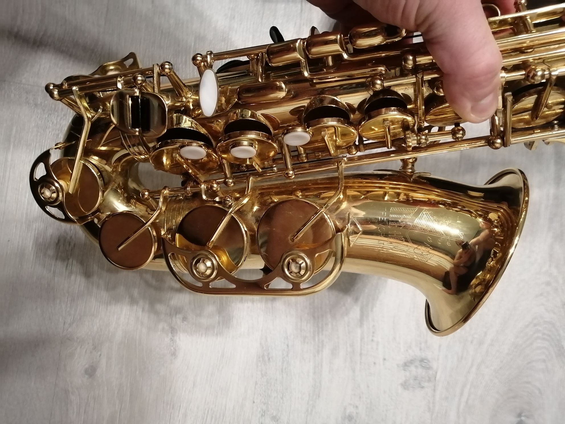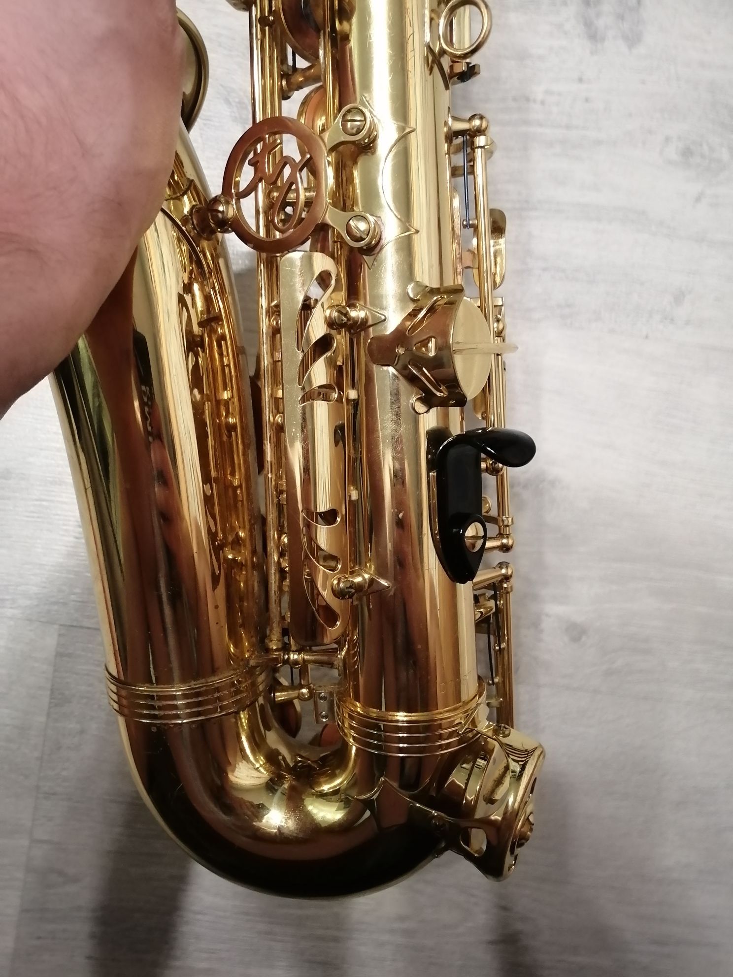 Комплектация полная: саксофон, эска, мундштук с лигатурой и колпачком , гайтан, фирменный очень удобный полужесткий кофр , трость, наклейки на мундштук, мундштук.