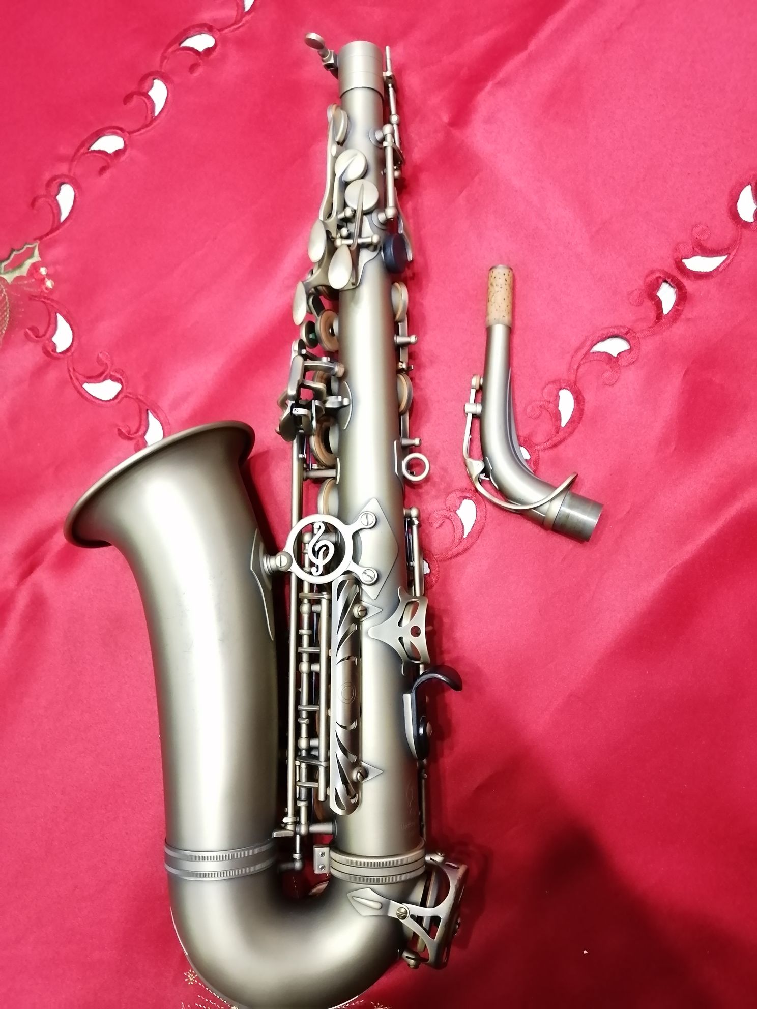 Комплектация полная: саксофон, эска, мундштук P. Mauriat с лигатурой и колпачком , гайтан, фирменный очень удобный (с заплечными лямками) полужесткий кофр "P. Mauriat", трости, смазка для эски, наклейки на мундштук.