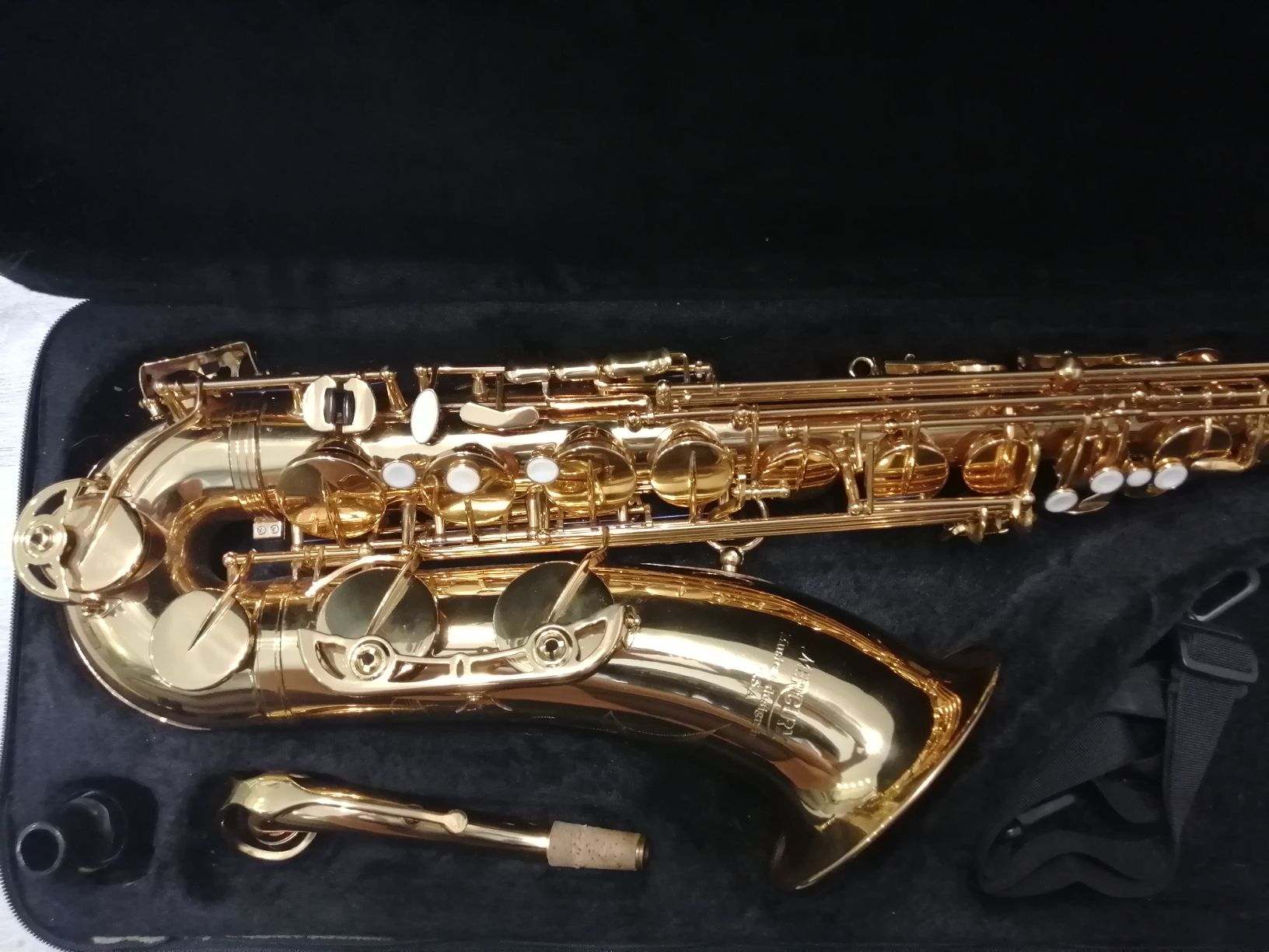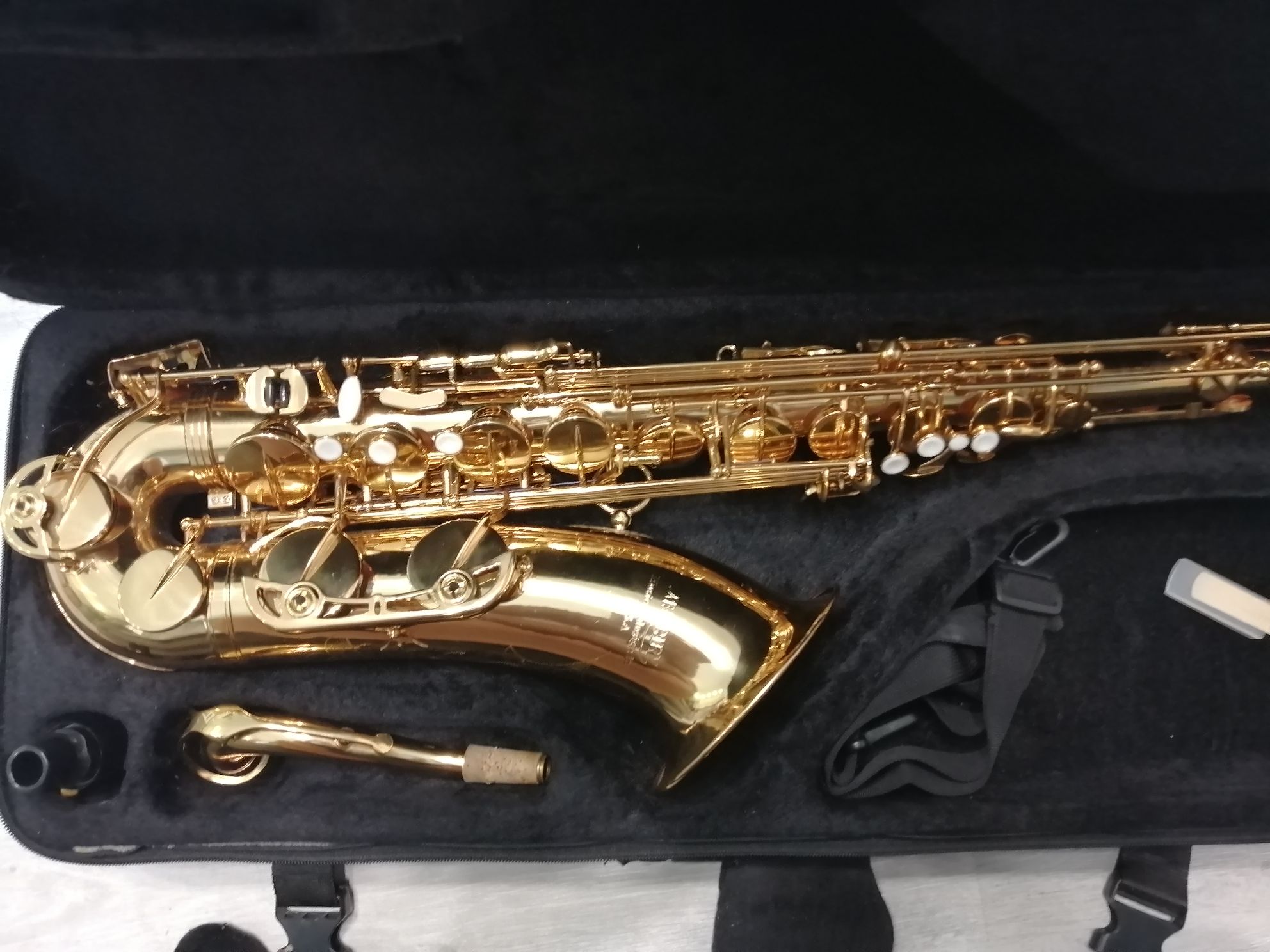 Комплектация полная: саксофон, эска, мундштук с лигатурой и колпачком, гайтан, чехол , трость.
