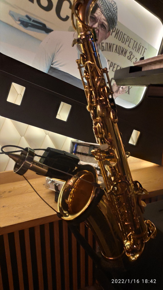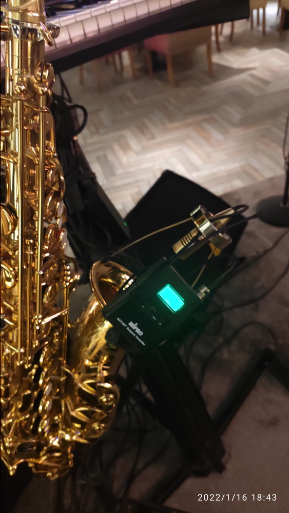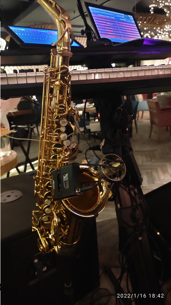 Передатчик можно снять с треноги, и использовать традиционно, на поясе, но на раструбе удобнее, никаких цепляющихся проводов, и ставится на сакс и снимается за 2 секунды!