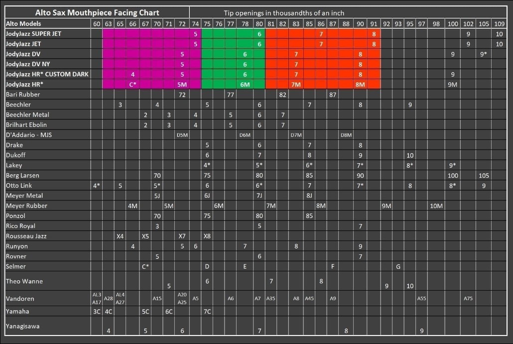 Еще хотел бы добавить. Такая схема сейчас можно сказать условная, даже относительно классики, т.е. Линка и Маера (без учета качества самих мундов). Если раньше фейс у маера был стандартной длины, то сейчас они в большинстве короче, чем раньше, ближе к классической , а у линка так и осталось (хотя тоже встречается покороче, хотя и реже). А если брать остальные мундштуки, то у них нет четкой стандартизации и один теноровый 100 (7ка) с длинным фейсом, будет не так сочетаться с альтовым 80(7ка) с коротким. Тут больше подойдет теноровый со стандартным и альтовый со средним, если придерживаться одного номера, на разных инструментах, т.е. по старой классической расчетной схеме. Когда у тенора скажем стандарт 26.5-27мм, а у альта около 25мм (полной расчетной длины). Сейчас же все сильно рандомно в этом плане и производители этого не указывают практически, поэтому в основном все сводиться к пробам...
