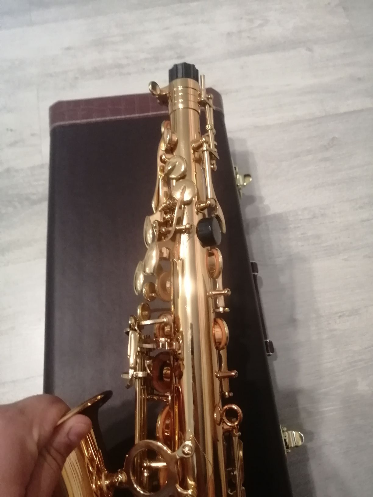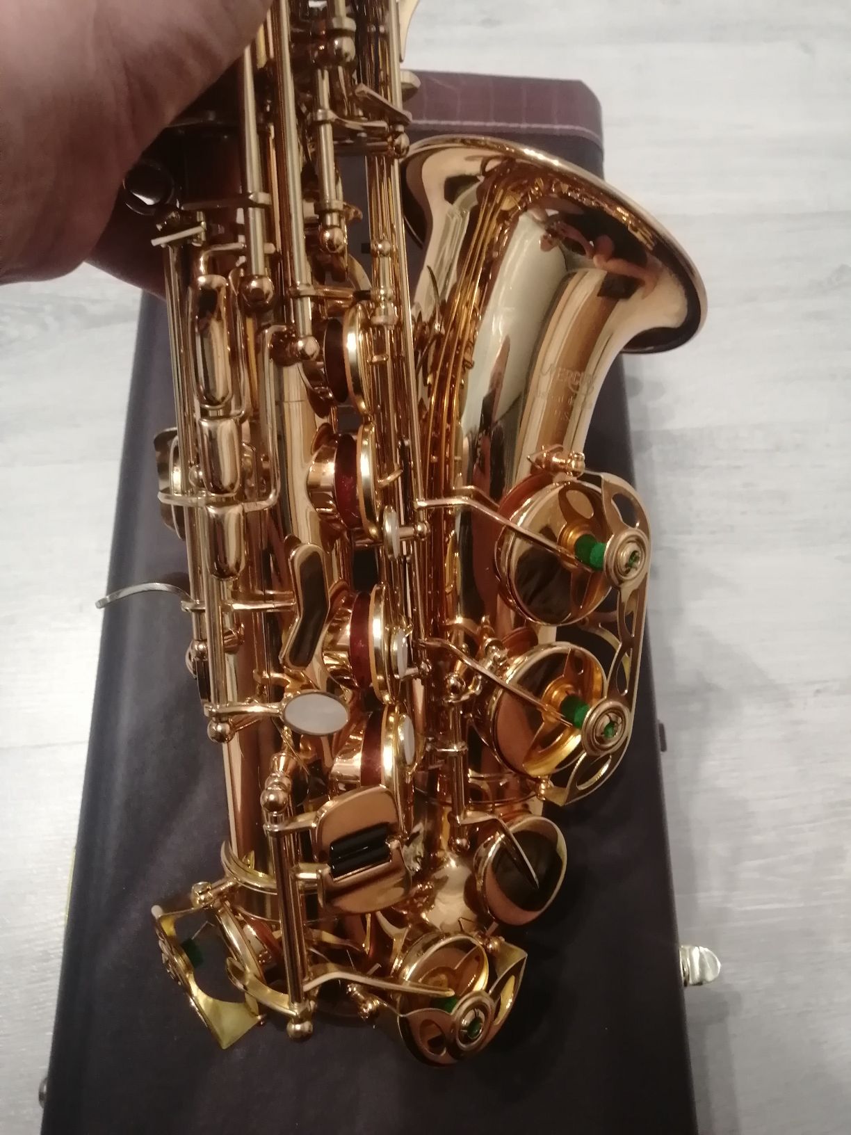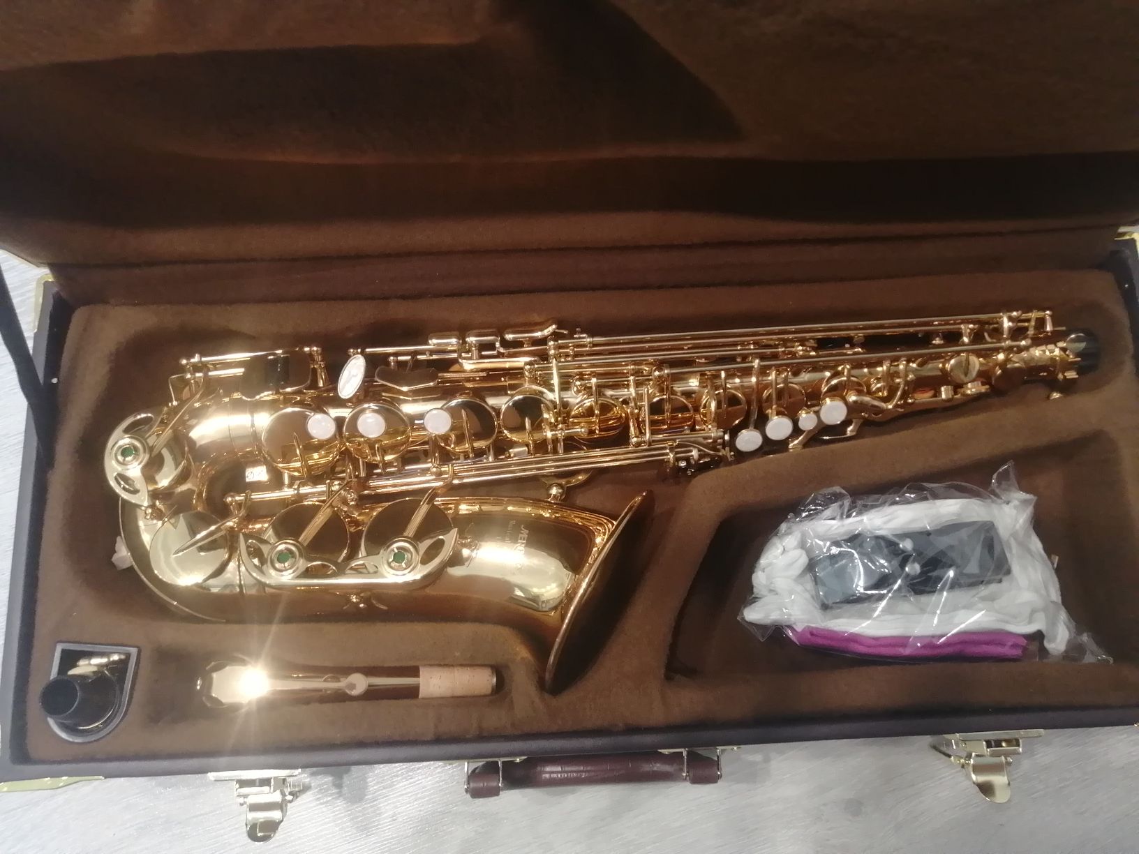 Комплектация полная: саксофон, эска, мундштук с лигатурой и колпачком , гайтан, трости, наклейки на мундштук, жёсткий кофр.